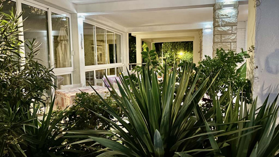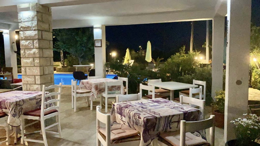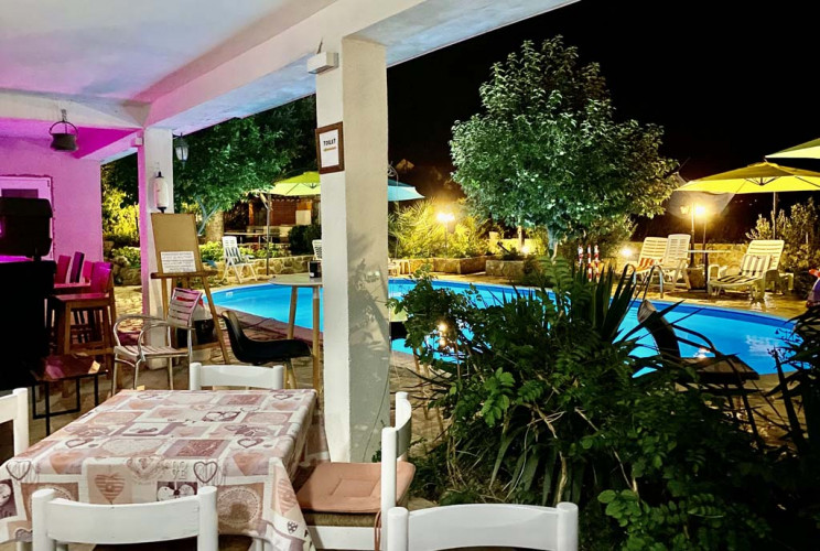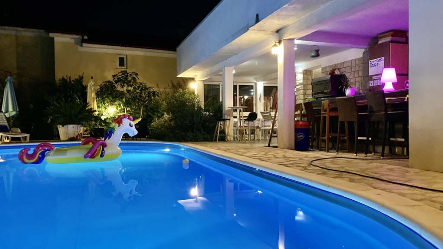 Abends nette Atmosphaere am beleuchteten Pool.